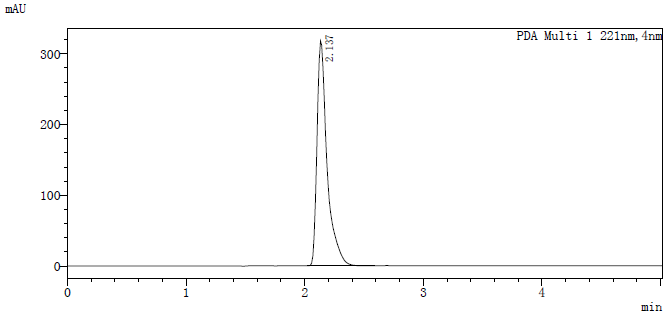 七、分析方法(僅供參考) 1.分析條件: 檢測器: HPLC-DAD 色譜柱: Inert sustain C18 (4.6mm×250mm,5μm ) 流動相: 乙腈: 水=85:15 波長: 221nm 流速: 1.0mL/min 進樣量: 1μL 2. 色譜圖