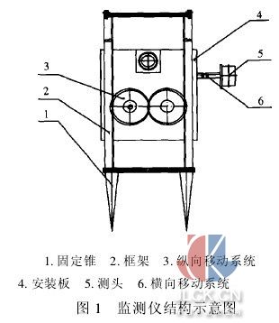 1需求分析 農(nóng)作物產(chǎn)量的預(yù)測(cè)預(yù)報(bào)是政府決策部門(mén)十分關(guān)注的問(wèn)題。20世紀(jì)80年代,遙感估產(chǎn)模型原理主要是利用遙感獲取的植被指數(shù)信息,建立不同空間尺度的單產(chǎn)或總產(chǎn)與植被指數(shù)之間簡(jiǎn)單線性相關(guān)的遙感估產(chǎn)模型,但大多數(shù)沒(méi)有考慮作物后期氣象條件對(duì)作物產(chǎn)量的影響,致使預(yù)測(cè)結(jié)果與生產(chǎn)實(shí)際產(chǎn)生較大誤差。為了建立可供農(nóng)業(yè)氣象產(chǎn)量預(yù)報(bào)業(yè)務(wù)使用的作物產(chǎn)量估算模型,必須綜合考慮作物關(guān)鍵生長(zhǎng)期的氣象因子(溫度和濕度)[1]。農(nóng)田監(jiān)測(cè)儀可以實(shí)時(shí)獲得作物生長(zhǎng)關(guān)鍵期的氣象參數(shù),為作物產(chǎn)量估算模型提供基礎(chǔ)數(shù)據(jù),并可為農(nóng)作物的生產(chǎn)管理提供依據(jù)。 2監(jiān)測(cè)儀的工作原理 農(nóng)田監(jiān)測(cè)儀主要由固定錐1、框架2、縱向移動(dòng)系統(tǒng)3、安裝板4、測(cè)頭5和橫向移動(dòng)系統(tǒng)6等部分組成,如圖1所示。監(jiān)測(cè)儀的測(cè)試對(duì)象主要是兩方面:農(nóng)田的溫度與濕度。農(nóng)田監(jiān)測(cè)儀測(cè)頭的橫向測(cè)量范圍為800-1000mm,縱向測(cè)量范圍為1500-1800 mm,橫向移動(dòng)速度和縱向移動(dòng)速度都不大于2米/分鐘。工作原理如下: