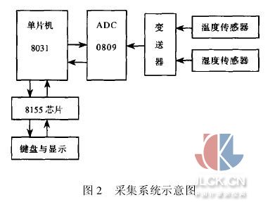 測(cè)試儀通過(guò)固定錐可以插到農(nóng)田土壤中,支撐整體結(jié)構(gòu)。縱向移動(dòng)系統(tǒng)和橫向移動(dòng)系統(tǒng)通過(guò)前后兩塊安裝板聯(lián)接成為一個(gè)整體,測(cè)頭安裝在橫向移動(dòng)系統(tǒng)的一側(cè)。當(dāng)需要測(cè)量某一高度的氣象因素時(shí),通過(guò)按鈕開(kāi)關(guān),向控制系統(tǒng)輸入一條指令,則縱向移動(dòng)系統(tǒng)中的步進(jìn)電機(jī)獲得一定的脈沖數(shù),驅(qū)動(dòng)兩個(gè)齒輪沿框架導(dǎo)軌進(jìn)行運(yùn)動(dòng),帶動(dòng)橫向移動(dòng)系統(tǒng)和測(cè)量系統(tǒng)一起上下移動(dòng),可實(shí)現(xiàn)測(cè)量某一高度的氣候參數(shù)。當(dāng)需要測(cè)量某一高度不同位置的的氣象因素時(shí),通過(guò)按鈕開(kāi)關(guān),向控制系統(tǒng)輸入一條指令,則橫向移動(dòng)系統(tǒng)中的步進(jìn)電機(jī)獲得一定的脈沖數(shù),驅(qū)動(dòng)與電機(jī)相聯(lián)的齒輪轉(zhuǎn)動(dòng),推動(dòng)測(cè)頭支撐桿進(jìn)行左右移動(dòng),達(dá)到預(yù)期的測(cè)量目的。 3采集系統(tǒng)設(shè)計(jì) 采集系統(tǒng)的采集對(duì)象是影響作物生長(zhǎng)的氣象因子:溫度和濕度,其工作原理見(jiàn)下圖2所示,采用8031單片機(jī)為主控制器,溫度測(cè)量元件采用薄膜鉑電阻溫度傳感器,采集范圍為0°到100°,輸入通道數(shù)和溫度測(cè)量范圍可由模塊進(jìn)行適量調(diào)整。濕度傳感器采用Philips公司生產(chǎn)的電容式濕度傳感器。該傳感器采用了具有迅速吸濕和脫濕的高分子聚合物薄膜材料作為電容器的介質(zhì),該濕敏電容的容量大小隨著周?chē)諝獾南鄬?duì)濕度的增大而增大,當(dāng)相對(duì)濕度從8%變化到90%時(shí),濕敏電容的容量從112pF變化到144pF[2] [3]。