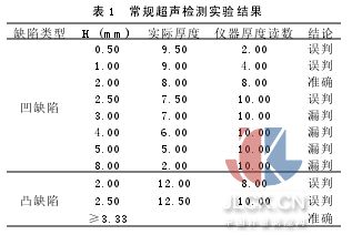 從圖5和典型數(shù)據(jù)表(表1)可以看到,使用常規(guī)超聲技術(shù)進行管道腐蝕檢測時: ●當內(nèi)壁腐蝕深度小于20%T0時,儀器檢測厚度小于實際厚度值,誤判腐蝕程度過重; ●當內(nèi)壁點坑的深度在20%T0~25%T0變化時,檢測厚度比實際值大,誤判腐蝕程度過輕; ●當內(nèi)壁腐蝕深度超過25%T0時,儀器檢測厚 度值不變,對面積小但很深的點坑漏判; ●當管道內(nèi)凸缺陷高度小于1/3T0時,把面積小凸缺陷加厚部位誤判為腐蝕減薄; ●只當管道內(nèi)凸缺陷高度大于1/3T0時,儀器計算出實際厚度值。