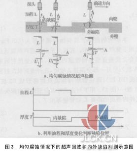 2均勻腐蝕情況超聲檢測[5] 如圖3a所示,由于均勻腐蝕面積大大超過探頭的聲束面積,超聲探頭在腐蝕區(qū)域內(nèi)只接收到腐蝕區(qū)表面波A和底波信號B??梢愿鶕?jù)接收的回波信號正確地計算出管道的壁厚值。 輸油管道腐蝕部位可能發(fā)生在管壁外表面,也可能處于管壁內(nèi)表面。超聲管道腐蝕檢測機器人檢測時,探頭都垂直于管道內(nèi)壁沿軸向方向以速度v前進。在前進過程中不斷發(fā)射超聲波脈沖測量油程L和厚度T。當超聲探頭到達內(nèi)表面均勻腐蝕部位時,管壁厚度減少,探頭與內(nèi)管壁間距離增大;當探頭前進到管壁的外表面缺陷時,管壁厚度減少,但探頭與內(nèi)管壁間距離沒有變化。這便可利用L和T的變化判斷缺陷到底是內(nèi)缺陷還是外缺陷(圖3b)。