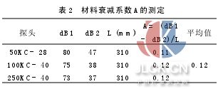△T=T2-T1(1) 式中T1—兩探頭相接,超聲波不通過碳棒的時間 T2—兩探頭通過碳棒對接超聲波通過碳棒的時間 △T—超聲波在碳棒中傳播時間 C=L/△T(2) 式中C—聲速,m/s L—試件長度,mm 2.4材料衰減系數(shù)α的測定 將發(fā)射和接收探頭對接,調(diào)節(jié)衰減器,使基準(zhǔn)為80%滿刻度,讀出dB1;再將兩探頭通過試棒,使接收波仍調(diào)到80%滿刻度,讀出dB2,然后計(jì)算出α如下(見表2):
