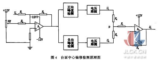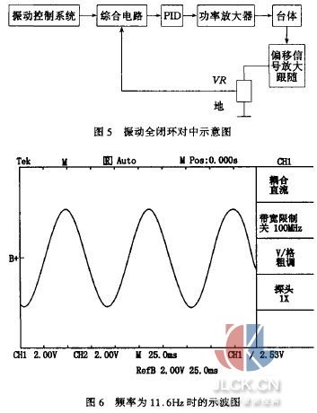 如圖4所示,在機(jī)械零位時,讓電渦頭對準(zhǔn)AB和AC的中線(參見圖3),調(diào)節(jié)電位器VR,使Al輸出為0,如果振動臺在臺面中心上下振動,則輸 出上下對稱的正弦波。這樣加在u;與u:之間為絕對值相等的正負(fù)電壓,RS與R6中間點的電位尸為。。如果臺體不在臺面中心振動,則尸不為O。尸的大小和 正負(fù)可以分別反映振動臺振動過程中,偏離臺面中心的程度和偏離方向。通過運算放大器氣引出該電壓值。然后再如圖5所示,將該偏差電壓引入振動臺閉環(huán)控制系 統(tǒng)中,用VR調(diào)節(jié)反饋量大小。實踐證明,采用該電路的對中方法很好地解決了振動臺臺面振動過程中的動態(tài)對中問題。