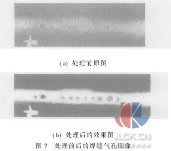 2.2氣孔缺陷的處理 現(xiàn)有一張焊縫中有大量成串氣孔的X射線探傷底片(圖7a),缺陷輪廓不清晰且有雜波。掃描輸入到計(jì)算機(jī)中,采用Photoshop軟件中的曲線對(duì)比度調(diào)整、魔棒選擇工具以及顏色減淡工具進(jìn)行處理。處理后的圖像效果見圖7b。 3結(jié)論 數(shù)字圖像處理作為一種新的處理手段,近年來在無損檢測領(lǐng)域的應(yīng)用越來越多。如在傳統(tǒng)的膠片成像X射線檢測技術(shù)、X射線數(shù)字成像技術(shù)(DR)、X 射線工業(yè)CT、中子射線成像技術(shù)及康普頓散射技術(shù)等都有應(yīng)用。對(duì)傳統(tǒng)的膠片成像X射線檢測進(jìn)行圖像的數(shù)字化和增強(qiáng)處理,使其清晰度和分辨率得到了很大改 善,且保存容易,工作強(qiáng)度大為減少。如利用適當(dāng)?shù)臉?biāo)準(zhǔn),將Photoshop處理過程做成批處理形式(專用濾鏡)就可大大提高處理效率。但是該方法的應(yīng)用 可靠性與掃描儀性能有很大關(guān)系,是目前普及到工業(yè)中的主要制約因素。