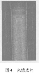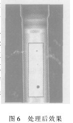 現(xiàn)有夾渣鈦管的X射線探傷底片一張,掃描輸入到計(jì)算機(jī)中(圖4),存在嚴(yán)重的劃痕且曝光不足。采用Photoshop軟件中的色階調(diào)整(直方圖調(diào)整)和曲線調(diào)整(灰度線性變換)命令,以及修復(fù)畫筆工具對(duì)其進(jìn)行處理。 在灰度圖像顏色模式中,曲線調(diào)整也可稱為灰度線性變換。一般在圖像曝光不足或曝光過度的情況下,圖像灰度值可能會(huì)局限在一個(gè)很小的范圍內(nèi),這時(shí) 在顯示器上看到的是一個(gè)模糊不清、似乎沒有灰度層次的圖像,所以用到的處理方法是灰度的線性變換,具體來說是分段線性變換,以對(duì)圖像中的每個(gè)像素的灰度值 作線性擴(kuò)展,從而擴(kuò)大整個(gè)圖像的像素灰度值范圍,有效改善圖像的視覺效果。分段線性變換可使圖像中的所有像素的灰度值在一定取值范圍內(nèi)作線性擴(kuò)展,而其它 取值范圍內(nèi)的灰度值所對(duì)應(yīng)的像素會(huì)被抑制,從而有效突出重點(diǎn)部分。該夾渣灰度線性變化前后的效果如圖5所示。圖像某些區(qū)域的灰度值范圍被明顯擴(kuò)大,以前灰 度值相近的像素對(duì)比度被拉大,缺陷輪廓更加清晰,圖像更有層次感,為進(jìn)一步分析作好了準(zhǔn)備。 雖然圖像效果得到了增強(qiáng),已經(jīng)可以判斷出缺陷的類型及缺陷所在的區(qū)域,但為更方便地判斷缺陷的大小,需對(duì)缺陷所在區(qū)域作進(jìn)一步處理。為了不影響 膠片其它區(qū)域,使缺陷更加突出,僅對(duì)缺陷所在的部分區(qū)域進(jìn)行處理。用矩形選框選中缺陷所在區(qū)域,再選擇合適的處理方法使缺陷的像素灰度值更低,背景的像素 灰度值更高,變換后的效果如圖6所示。