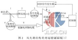 引言 紫外可見光譜區(qū)通常指190~780 nm的波長范圍,因為溶液中待測物分子中的價電子能夠選擇性地吸收紫外或可見光從基態(tài)躍遷到激發(fā)態(tài)形成紫外可見吸收光譜,從光源輻射出的光經(jīng)過波長選擇器成為單色光通過待測溶液時被具有一定特征吸收的化合物吸收,吸收大小與溶液中待測物濃度的關(guān)系符合朗伯-比爾定律;以溶液本身作參比用兩束不同波長的兩束單色光λ1、λ2(Δλ=1~2 nm)雙波長掃描快速交替通過檢測器后產(chǎn)生交流信號,計測軟件自動求得吸光度差值ΔA其與溶液濃度成正比而產(chǎn)生的定量光信號經(jīng)過光電探測器后轉(zhuǎn)化為較弱電信號經(jīng)過放大、A/D轉(zhuǎn)換直接輸出到PC上通過計測軟件對結(jié)果顯示與打印;本文采用一束光通過半反透鏡對雙路光電探測器輸出的數(shù)據(jù)信號同步采樣處理較好地抑制了溫漂和器件特性分布誤差,進(jìn)而降低了系統(tǒng)噪聲;而直接片內(nèi)電流積分、電荷采樣有效地避免了各級放大電路的累計轉(zhuǎn)換誤差減少了模擬器件的數(shù)量充分發(fā)揮了現(xiàn)有數(shù)字集成電路和數(shù)字信號處理系統(tǒng)的優(yōu)勢,從而有效地提高了光度計系統(tǒng)的綜合性能指標(biāo)。 1雙路結(jié)構(gòu)的光電檢測系統(tǒng)研究 當(dāng)單色光通過待測溶液時,被溶液中具有一定特征吸收的化合物吸收,吸收大小與溶液中待測物濃度的關(guān)系符合朗伯-比爾定律:式中:A為吸光度;φ0為入射光通量;φtr為透射光通量;T為投射比,K為吸收系數(shù);b為光路長度;c為溶液中待測物濃度。當(dāng)光路長度b與吸收系數(shù)K一定時,吸光度A與溶液中待測物濃度c成正比利用此定律可進(jìn)行定量分析;分光光度計的整體結(jié)構(gòu)如圖1所示。分光光度計主要由光源、樣本區(qū)、單色器(色散)、信號光電探測器、信號處理、LED顯示、計測軟件等部分構(gòu)成[1 ];而本文的雙光路結(jié)構(gòu)的光電檢測系統(tǒng)如圖2所示。