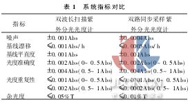 在開機上電后系統(tǒng)本身要將系統(tǒng)中所有的命令以及有關(guān)的存儲單元設(shè)置為初始狀態(tài)并完成系統(tǒng)的自診斷,當(dāng)有故障發(fā)生時給出報警并在PC上給出錯誤信息;步進(jìn)電機是將電脈沖信號轉(zhuǎn)換成機械角位移的執(zhí)行元件,其特征是輸入一電脈沖就轉(zhuǎn)動一步,轉(zhuǎn)子的角位移的大小及轉(zhuǎn)速分別與輸入的電脈沖數(shù)及其頻率成正比且在時間上與輸入脈沖同步,計測軟件根據(jù)用戶要求及位置信號通過驅(qū)動程序?qū)Σ竭M(jìn)電機發(fā)出控制指令,輸入電脈沖的數(shù)量、頻率以及電機繞組通電相序并通過RS232傳輸給下位單片機即可獲得所需的轉(zhuǎn)角、轉(zhuǎn)速、轉(zhuǎn)向并驅(qū)動電動機實現(xiàn)對光學(xué)或機械部件到達(dá)指定位置的自動控制;而數(shù)據(jù)采集包括A/D驅(qū)動、通信及其存儲部分,在完成數(shù)據(jù)處理后用戶將通過系統(tǒng)接口與打印機連接輸出測量的結(jié)果。 3系統(tǒng)的相關(guān)性能指標(biāo)比較 表1所示為雙路同步采樣紫外分光光度計與常見雙波長掃描紫外分光光度計的相關(guān)性能指標(biāo)對比,從表1可以得出本系統(tǒng)主要性能指標(biāo)明顯優(yōu)于常見雙波長掃描紫外分光光度計指標(biāo);這里雜光度是指在紫外區(qū)測定220 nm(NaI)或340 nm(NaNO3)處的透過率%T、在可見光區(qū)用384 mg/L的KMnO4測定525 nm處的透過率%T[7];光度準(zhǔn)確度采用重鉻酸鉀的0.005 mol/L H2SO4溶液進(jìn)行檢查;系統(tǒng)的穩(wěn)定性采用在時間掃描方式下光度計預(yù)熱2 h、在500 nm波長處連續(xù)測量1 h由所記錄的吸光度-時間光譜圖曲線的峰-峰值測定;光度噪聲采用時間掃描方式下在500 nm波長處連續(xù)測量120 s,由所記錄的吸光度-時間光譜圖量出峰-峰值測定即為噪聲,改變響應(yīng)時間可改善信噪比;鑒于采用對雙路光電探測器輸出的數(shù)據(jù)信號同時采集的處理結(jié)構(gòu)較好地抑制了溫漂和器件特性分布誤差進(jìn)而降低了系統(tǒng)噪聲,而直接片內(nèi)電流積分、電荷采樣有效地避免了各級放大電路的累計轉(zhuǎn)換誤差,充分發(fā)揮了數(shù)字控制優(yōu)勢從而有效地提高了光度計系統(tǒng)的綜合性能指標(biāo)。