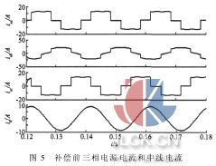2仿真結(jié)果 A、B、C三相電源接晶閘管整流橋(阻感負(fù)載,R=30Ω,L=15 mH),B相同時(shí)還接有一個(gè)單相整流橋(R=20Ω)。仿真電路的參數(shù)為:SVG的接入電感為0.8 mH,電源電壓為380 V,直流側(cè)的電容電壓通過(guò)調(diào)節(jié)達(dá)到950V,開(kāi)關(guān)頻率為20kHz。補(bǔ)償前的電源電流和中線(xiàn)電流iO的仿真波形如圖5所示