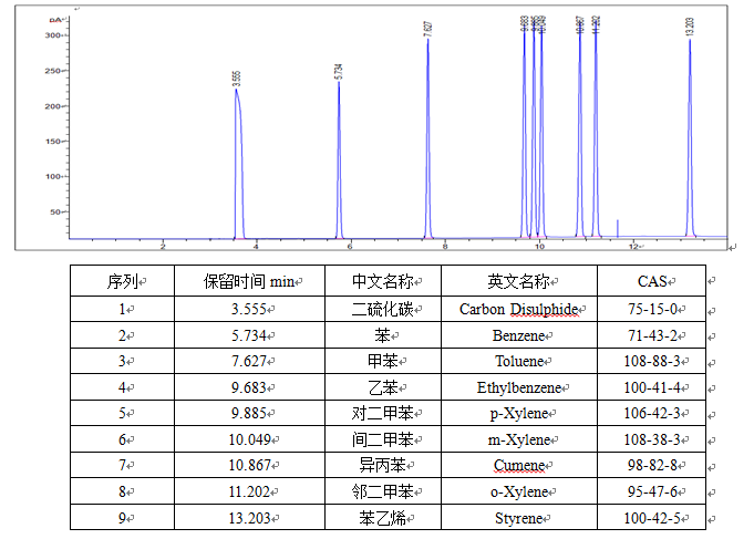 六、適用范圍(本標(biāo)準(zhǔn)溶液適用但不限于以下分析標(biāo)準(zhǔn)) GB/T 5750.8[生活飲用水標(biāo)準(zhǔn)檢驗(yàn)方法有機(jī)物指標(biāo)頂空-毛細(xì)管柱氣相色譜法] HJ 583[環(huán)境空氣苯系物的測(cè)定固體吸附/熱脫附-氣相色譜法] HJ 686[水質(zhì)揮發(fā)性有機(jī)物的測(cè)定吹掃捕集/氣相色譜法] GB/T 11890 89[水質(zhì) 苯系物的測(cè)定 氣相色譜法] 七、分析方法(僅供參考) 1.分析條件: 色譜參考條件: GC-FID 色譜柱: SGE-WAX (30m×0.32mm×0.5μm) 進(jìn)樣口: 220°C 檢測(cè)器: 250°C 柱 箱: 50°C(2min)→6°C/min→120°C(1min) 2. 色譜圖